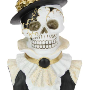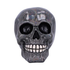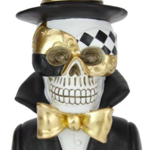 Black skull figurines with silver accents, showcasing bold hand gestures—one with a rude finger and the other with the iconic rock fingers pose. Each measures 19cm, making them a striking addition to alternative or edgy decor styles.