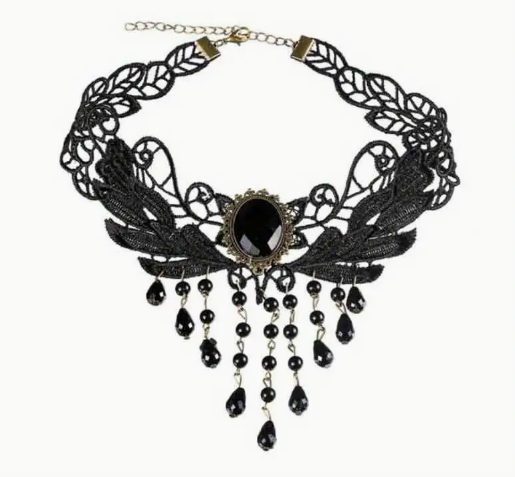 A black choker adorned with delicate leaf motifs and embellished with beads, offering a subtle nature-inspired elegance to your ensemble.