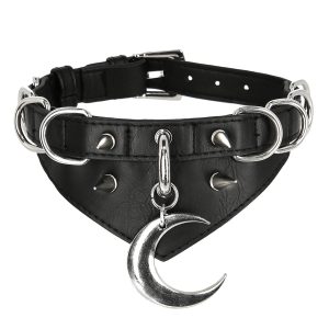Made of vegan leather, adjustable collar with metal moon decoration, big ring, spikes and chains.