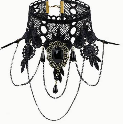 A black lace choker adorned with intricate rosettes, accentuated by dangling chains and a striking black stone, embodying an elegant yet edgy aesthetic.