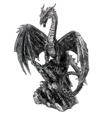 An antique black dragon figurine with it's wings spread, perched majestically on a cliff, evoking a sense of mystique and power in its ancient presence.