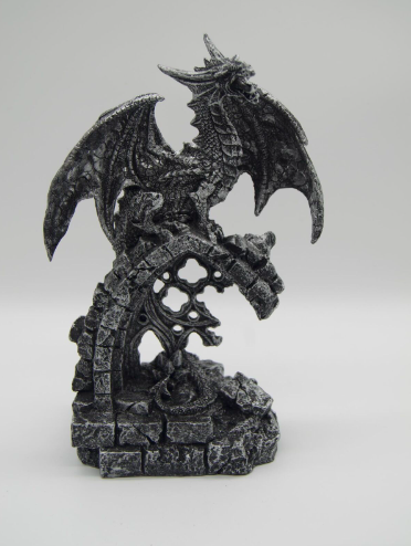 An antique black dragon figurine guarding an ancient, crumbling, mystical realm door, exuding an aura of power and enigma in its majestic presence.