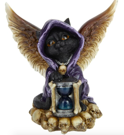 / Figurine Skull Cat Witch with Wings Holding Hourglass 16cm