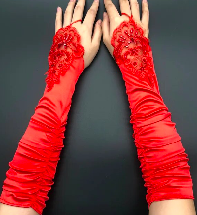 Gloves Fingerless Red Satin & Beaded Lace Long