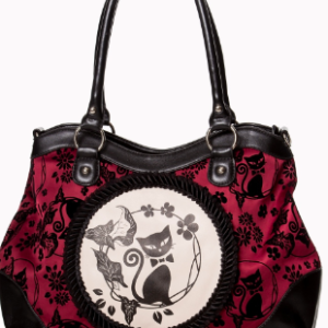 This phenomenal dark, gothic bag features a skeleton hand with a red skull rose on a flocked background. A zipper pocket at the back, double hand straps, d-rings detail and it fastens with a top zipper.