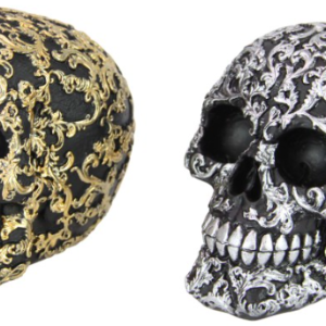 Black skull figurines with silver accents, showcasing bold hand gestures—one with a rude finger and the other with the iconic rock fingers pose. Each measures 19cm, making them a striking addition to alternative or edgy decor styles.