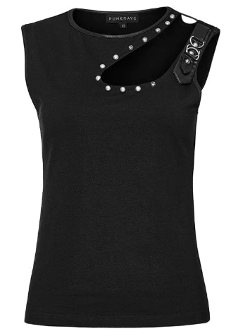 This punk tank top is hollow-out on the left shoulder. Rivets and pointed strap decorated on the left shoulder. Slim fitted silhouette and good elastic fabric.