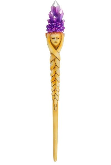 This stunning resin wand features a pearlescent, purple crystal cluster atop the head of a serene goddess. With a braided stem details and beautiful design, this wand is fit for a queen. Please note that this wand is not a toy and should be handled with care.